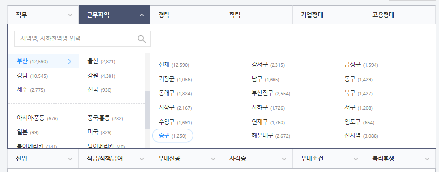 ② 채용정보를 누르시고, 지역별 세부메뉴로 들어가서 부산 > 중구를 선택하세요.