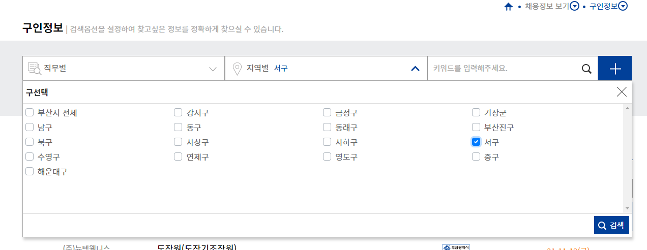 다만, 지역별로 범위를 특정하여 일자리 검색을 원하시면, 아래와 같이 구인정보란에 지역별 칸을 들어가셔서 '서구'를 선택하시면 서구에서의 일자리만 볼 수 있습니다.