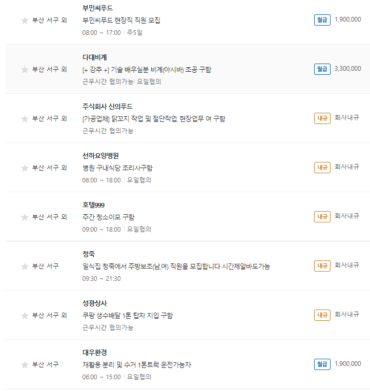 ③ 포스팅 시점에 약 300여건의 일자리가 있습니다. 부산 서구 뿐만 아니라 인근지역의 일자리도 같이 검색하시면 보다 폭 넓게 본인이 원하는 일자리를 찾으실 수 있습니다.
