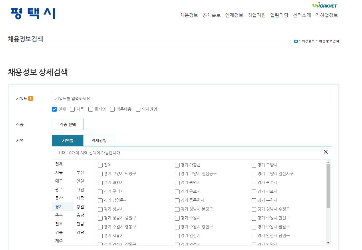 아래와 같이 워크넷에서 제공하는 일자리중에 평택시에 조건에 맞는 일자리를 검색하여 아래와 같이 보여줍니다. 채용정보를 누르시면 현재 구인구직중인 일자리를 한눈에 볼 수 있습니다.