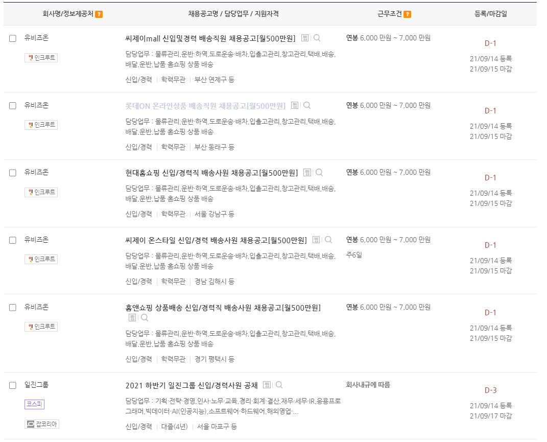 평택에서 출발하여 각자의 거주지난 희망지에 배치되는 물류배송 직무는 주 6일근무 조건이 대부분입니다.