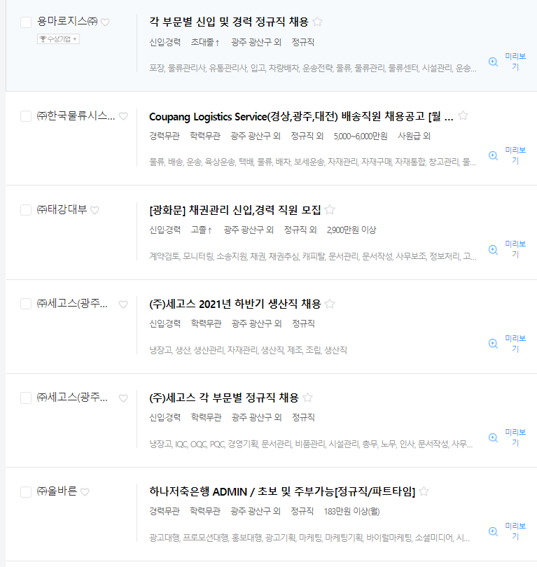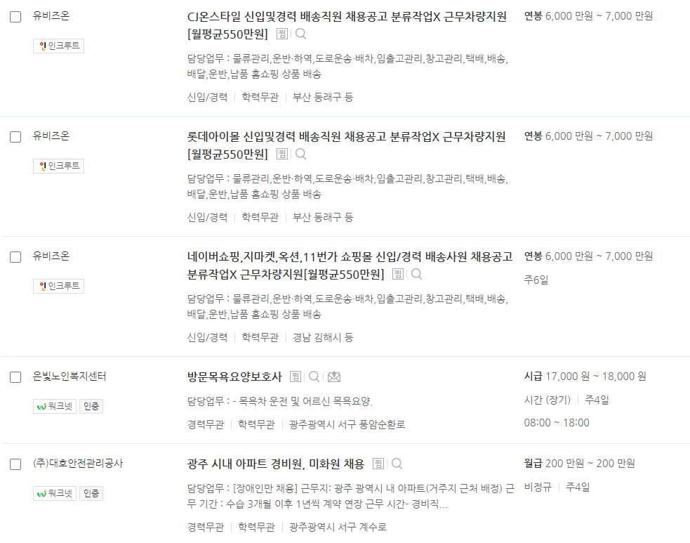 물류분야부터 요양보호사, 경비, 미화, 사무직, 생산보조까지 다양한 일자리가 존재합니다. 이번에는 아래와 같이 잡코리아를 통해서 일자리를 알아보겠습니다.