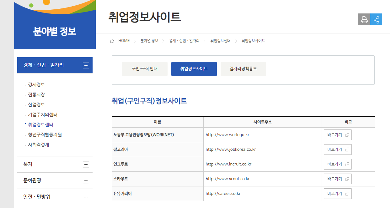 메인화면 상단메뉴에 분야별 정보를 클릭하세요. 그리고, 취업정보센터를 클릭하세요.