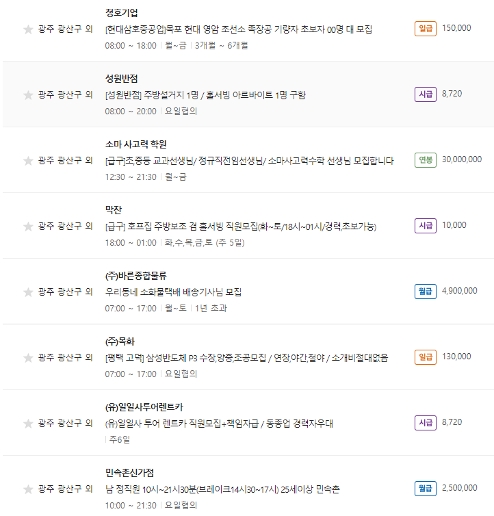 광주광역시 광산구 일자리 워크넷 구인구직 정보