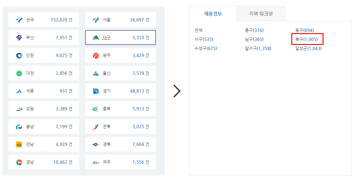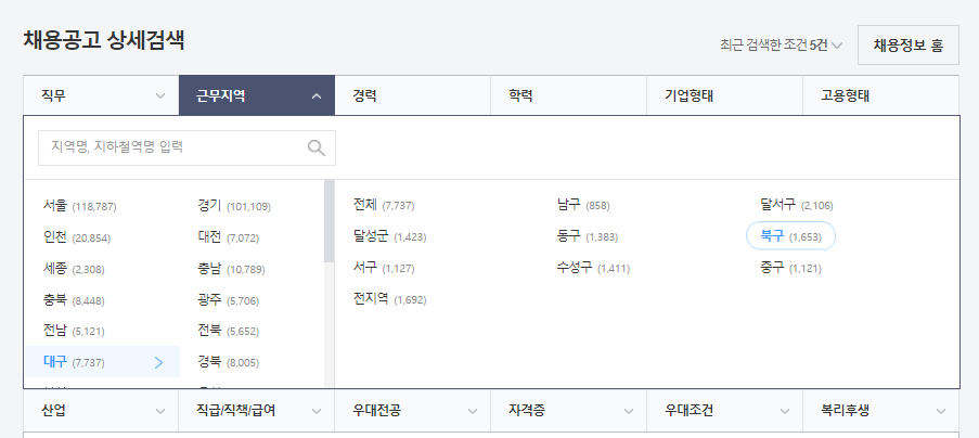 ② 채용정보를 누르시고, 지역별 세부메뉴로 들어가서 대구 > 북구를 선택하세요.