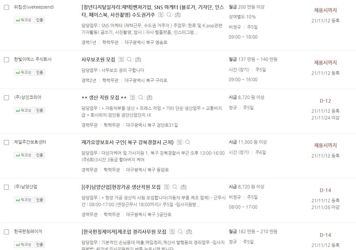 대구 북구 워크넷 일자리 알아보기
