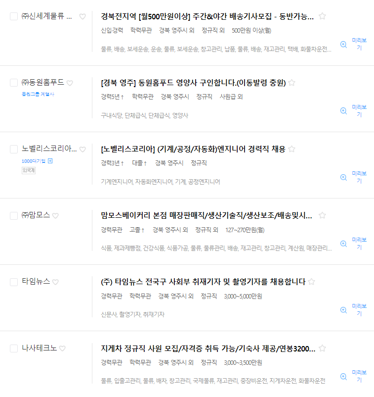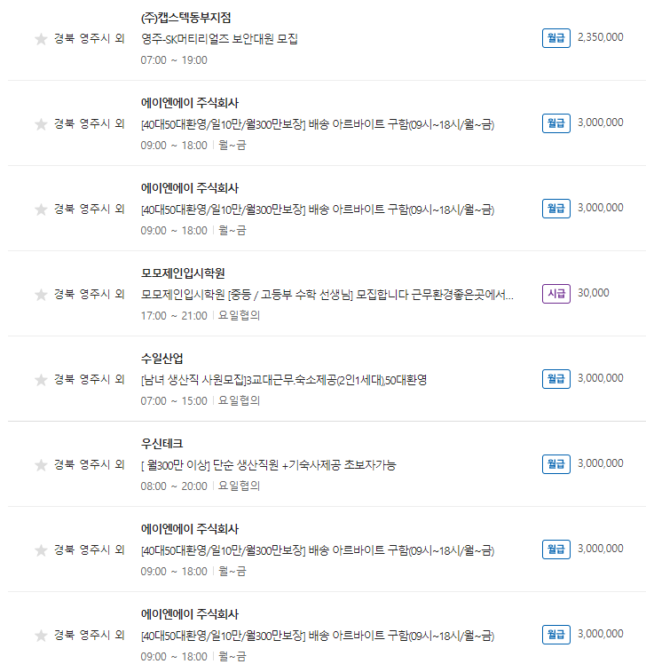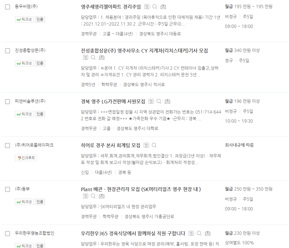 ③ 포스팅 시점에 약 200여건의 일자리가 있습니다. 영주시 뿐만 아니라 인근지역의 일자리도 같이 검색하시면 보다 폭 넓게 본인이 원하는 일자리를 찾으실 수 있습니다.