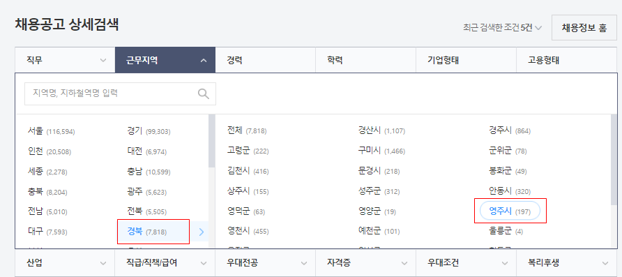 ② 채용정보를 누르시고, 지역별 세부메뉴로 들어가서 경북 > 영주시를 선택하세요.