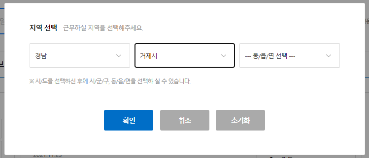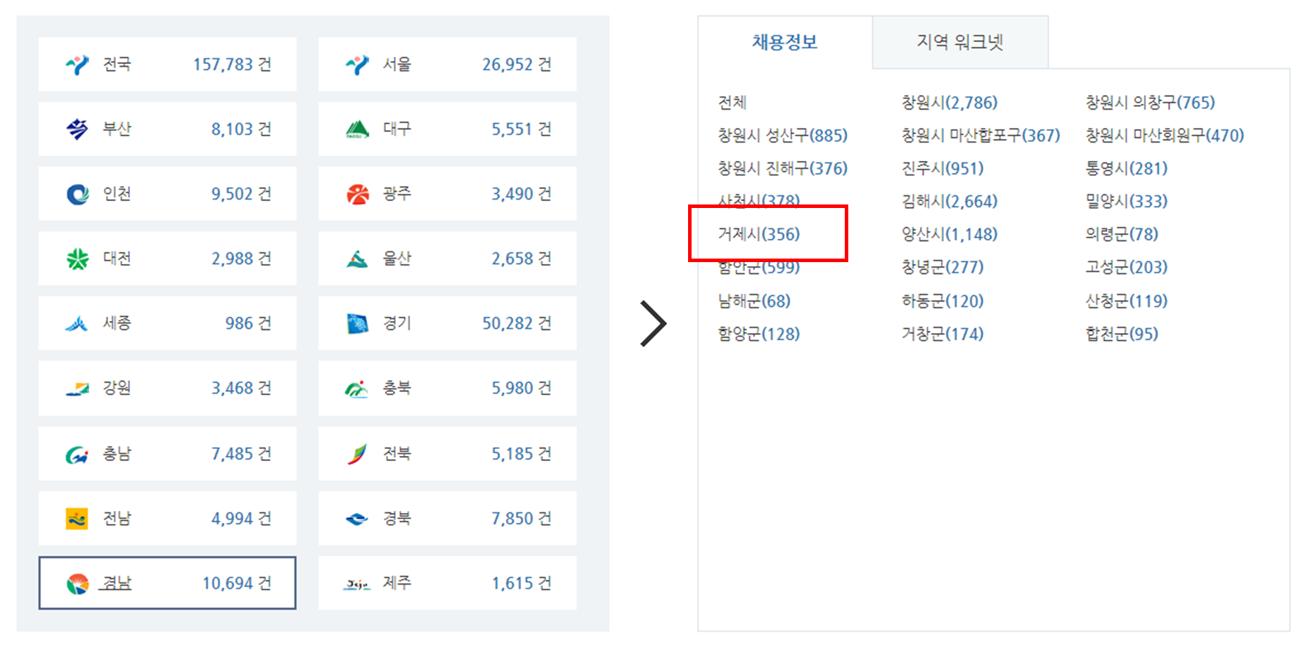 ② 채용정보를 누르시고, 지역별 세부메뉴로 들어가서 경남 > 거제시를 선택하세요.