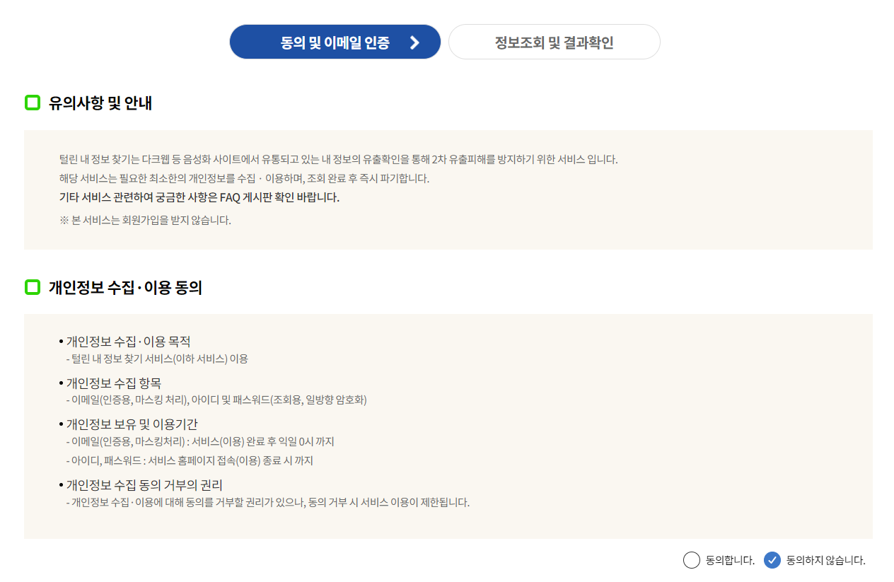 o 사용자가 입력한 정보는 일방향 암호화(HASH) 및 조회 후에 즉시 파기 또는 본인인증용 이메일주소는 익일 0시까지 보관 및 파기하며, 비교·대조하기 위한 데이터 역시 HASH로 안전하게 처리 및 보관하고 있으므로, 안심하고 사용하시기 바랍니다.