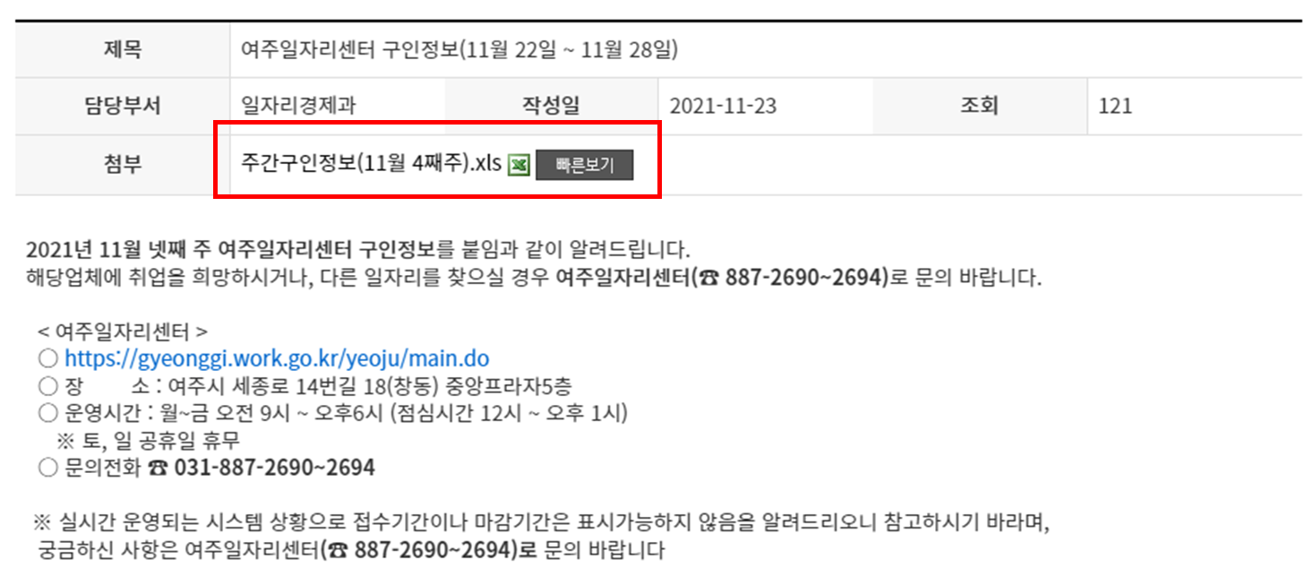 ③ 여주시는 매주 주차별로 일자리를 첨부파일로 정보게시하고 있습니다.
