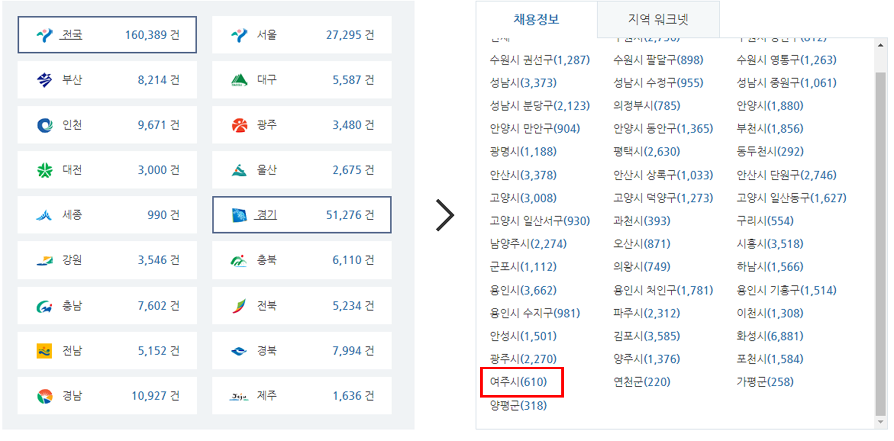 ② 채용정보를 누르시고, 지역별 세부메뉴로 들어가서 경기도 > 여주시를 선택하세요.