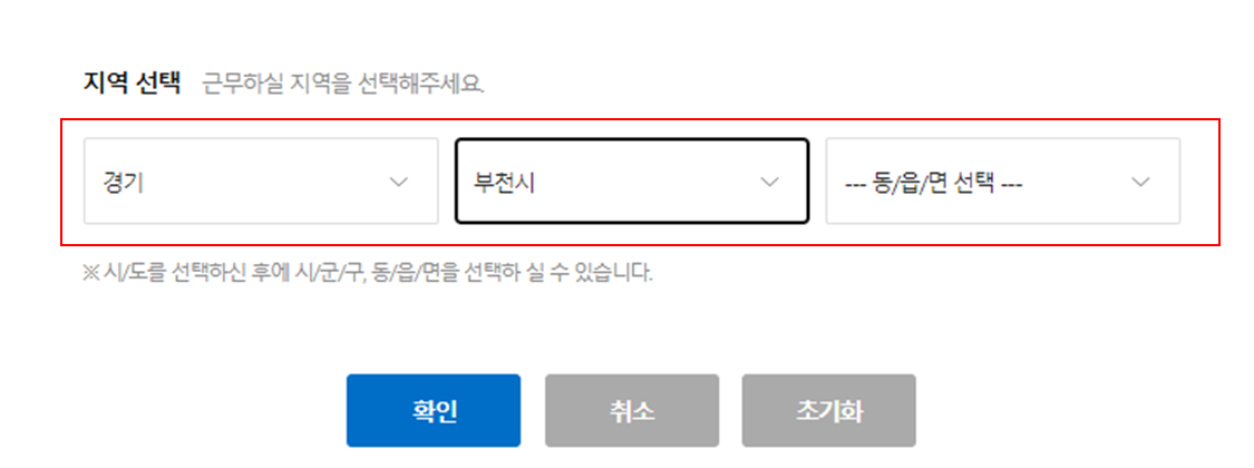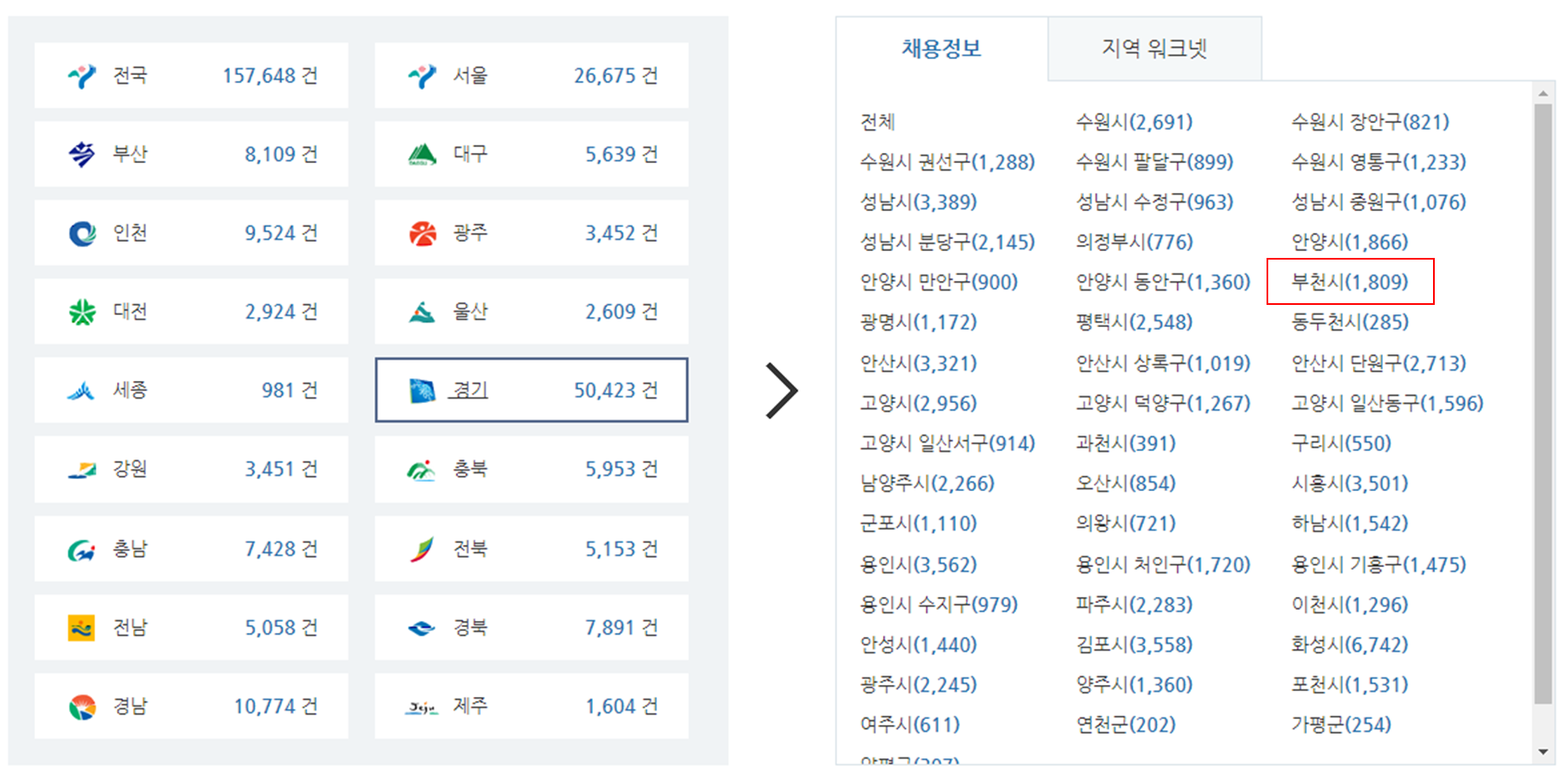 먼저, 잡코리아에 접속 후 > 지역별 세부메뉴에서 경기도, 부천시를 선택하시면 됩니다.