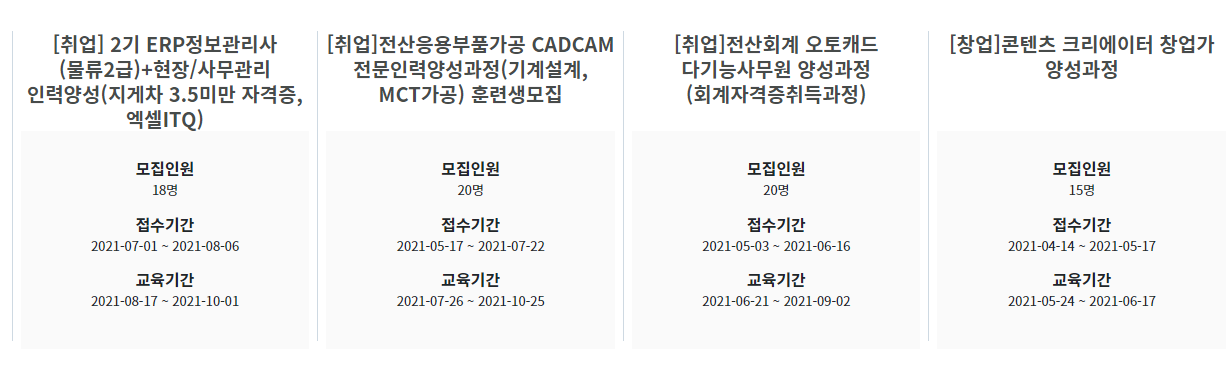 그 중에서도 청년층을 위한 일자리만을 소개해드리자면, 일정 교육 및 인턴을 거치고 취업되는 과정이 잘 활성화 되어 있습니다. ERP정보관리자, 물류2급 자격증 소유자 교육 및 취업지원, 전산응용부품가공 CAD, CAM, MCT 인력양성 취업연계형 교육, 콘텐츠 크리에이더 창업가 양성과정등이 게시되어 있습니다.