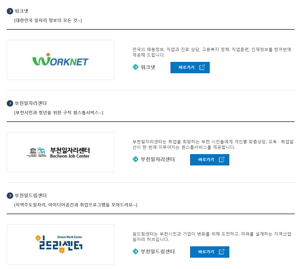 ② 청년일자리, 부천 일자리센터, 일드림센터 등 각각 사이트블 별도로 운영하고 있습니다.