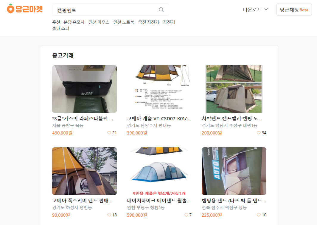 특정 브랜드를 지칭하지 않아도 '캠핑텐트'라는 키워드로 여러 상품이 검색됩니다. 초보캠핑일 경우에는 새것으로 사기에 부담되는 경우가 많이 있습니다. 당근마켓은 이럴 경우 참 유용하고, 어찌보면 이웃끼리 거래하는 것이기 때문에 더 쉽게 설명해주고 경험적인 노하우를 많이 공유합니다.