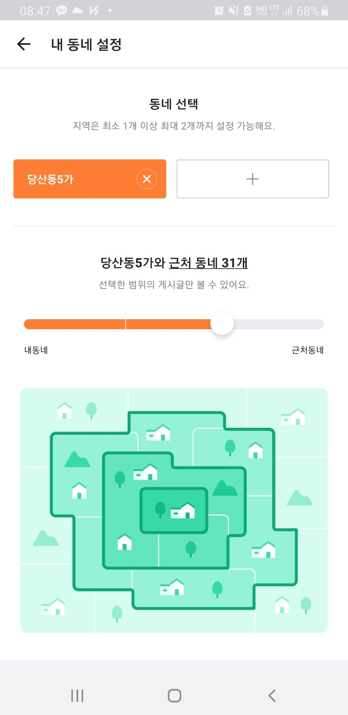 동네 추가 설정은 플러스 버튼을 누르고 지역검색을 해서 등록 하면 됩니다. (직장이나 자주 활동하는 지역으로 많이 합니다. 또는, 본인이 사는동네와 옆동네로 해서, 본인의 거주에서 거점을 넓혀서 하는 경우도 있습니다.)