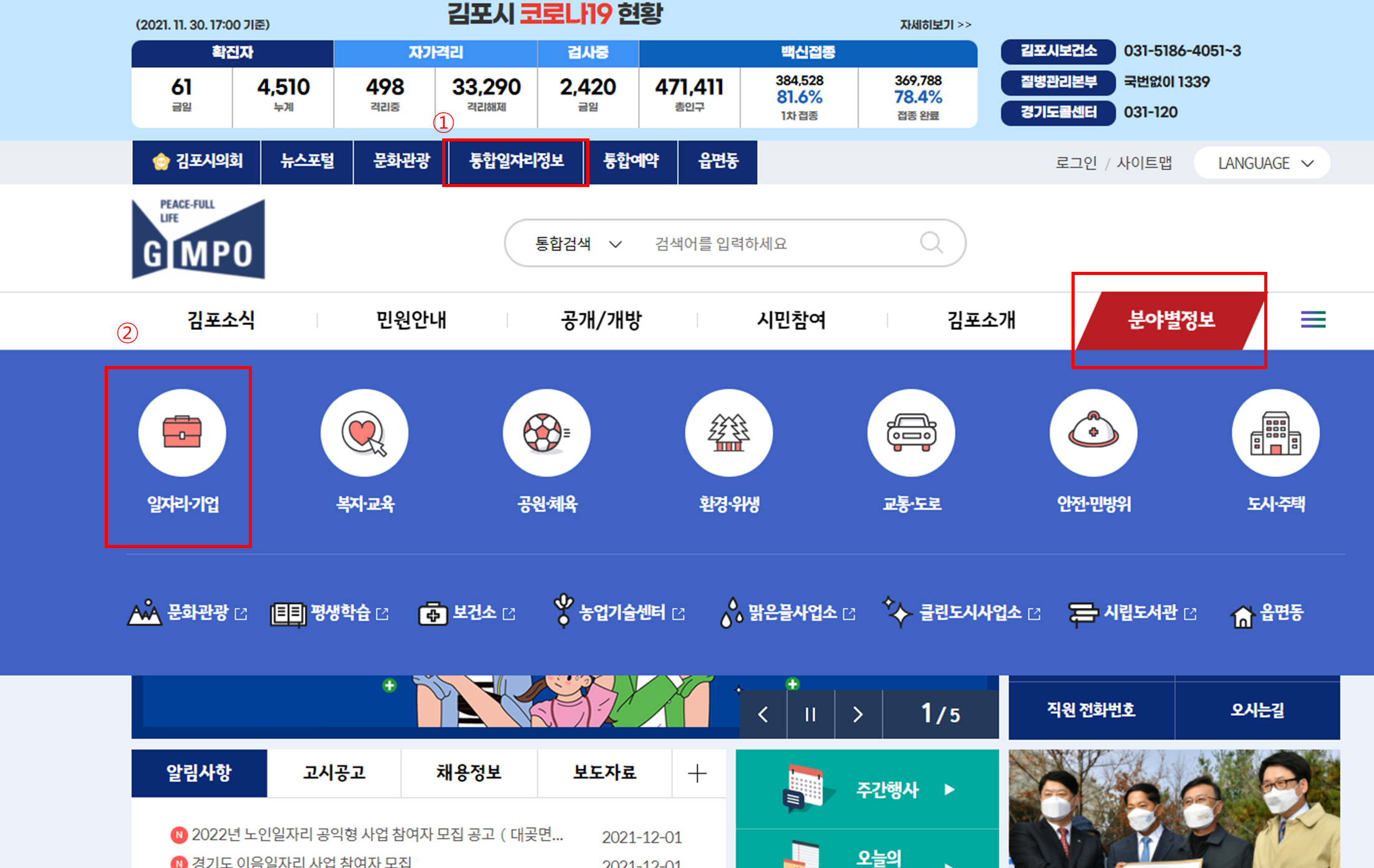 ① 김포시청 홈페이지를 들어갑니다. 아래의 설명과 같이 상단의 통합일자리 정보를 선택하거나, 분야별 정보 > 일자리,기업을 선택하시면 됩니다.