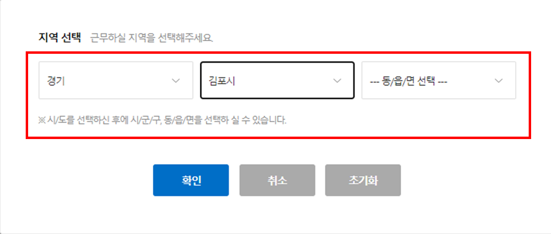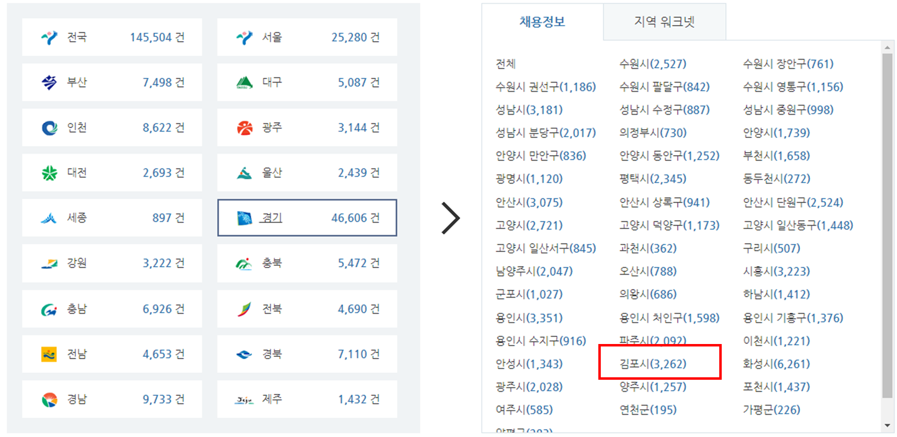먼저, 잡코리아에 접속 > 지역별 세부메뉴에서 경기도, 김포시를 선택하시면 됩니다.