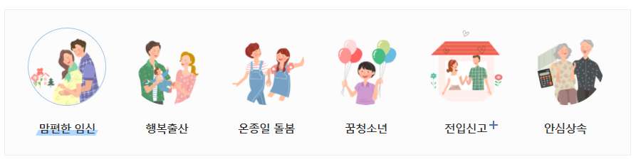 생애주기기별 서비스는 영유아, 아동청소년, 청년, 중장년, 어르신등이 사회생활 및 생활에 필요한 주요 증명서 및 확인서 출력등을 편리하게 이용할 수 있습니다.