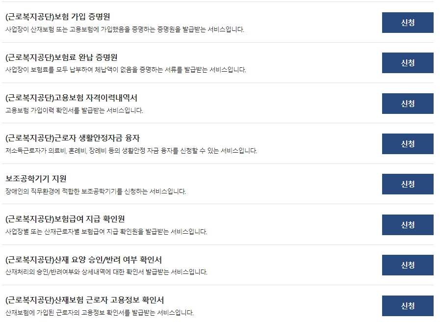 보험가입 증명원, 근로자 생활자금 융자 서비스 신청서비스, 산재 요양 승인/반려 확인서, 귀농귀촌종합센터, 구인구직등의 중장년에 필요한 유용한 서비스를 제공합니다.