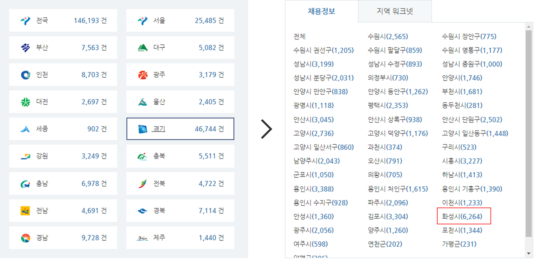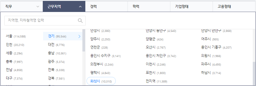 먼저, 잡코리아에 접속 > 지역별 세부메뉴에서 경기도, 화성포시를 선택하시면 됩니다.