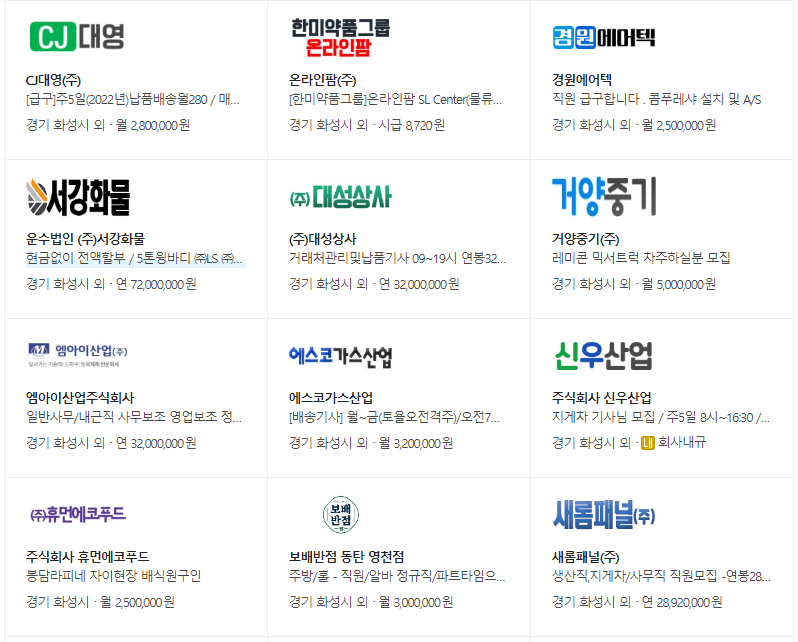 납품배송직, 온라인팜 물류창고 관리/담당직원, 콤푸레샤설시 AS 기사 모집, 사무보조, 지체차 기사님 모집, 패널 생산 및 사무직, 식당 주방/홀서빙, 아파트 경비, 요양보호사, 미화직등의 일자리가 있습니다.