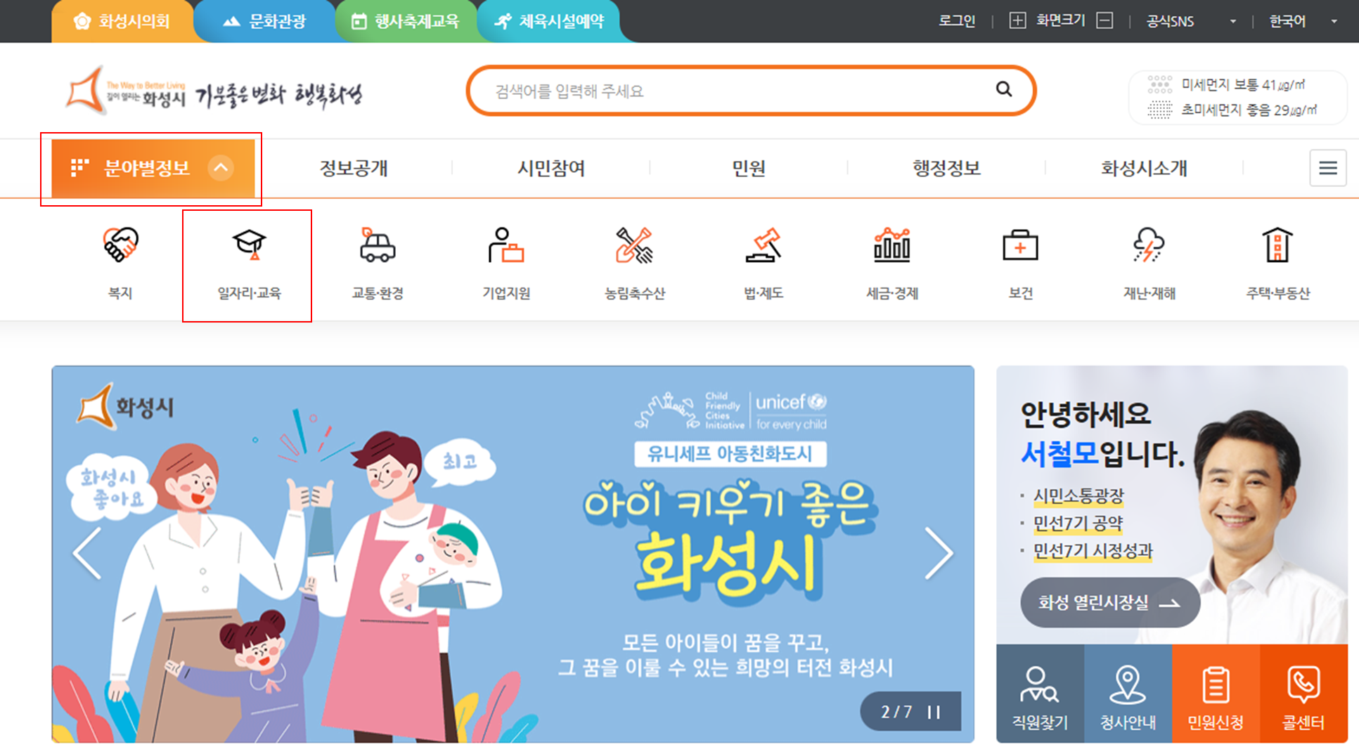 ① 화성시청 홈페이지를 들어갑니다. 분야별 정보 > 일자리, 교육을 선택하세요.