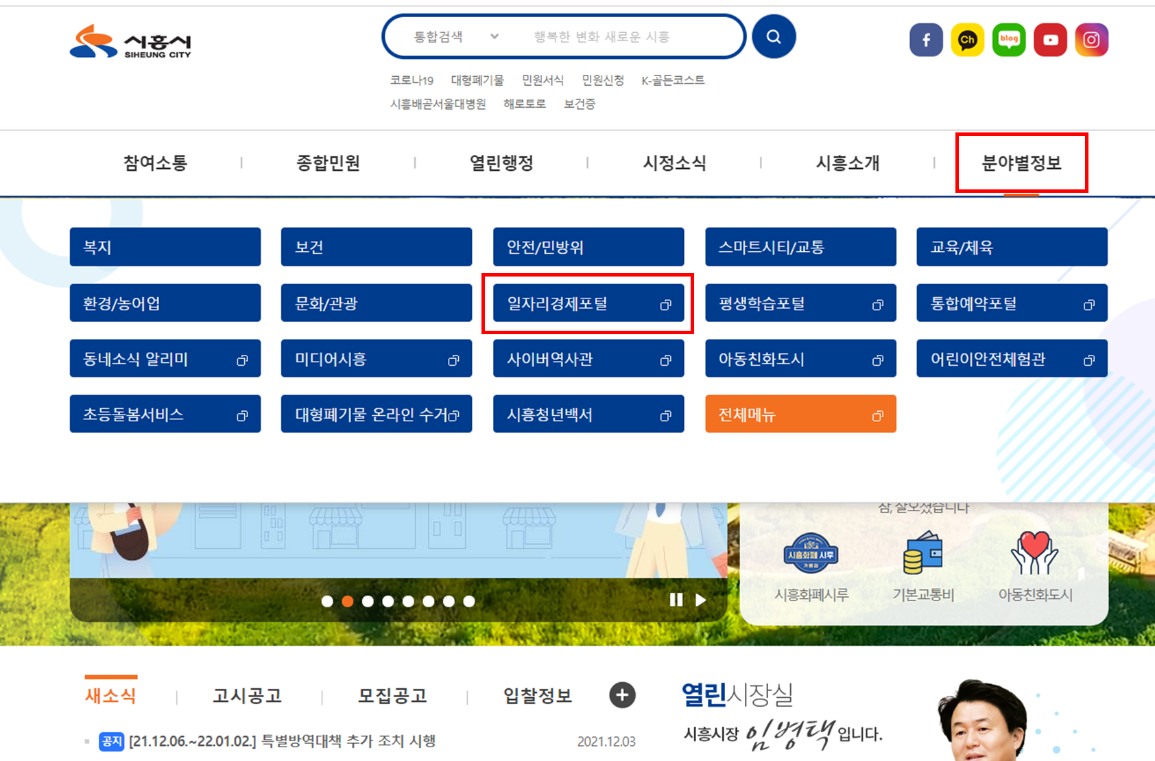 ① 시흥시청 홈페이지를 들어갑니다. 상단 우측 메뉴에 분야별 정보 > 일자리 경제, 포털을 선택하셔도 되고, 시흥시 메인 홈페이지에 '일자리 경제포털'이라는 아이콘을 선택하셔도 됩니다.
