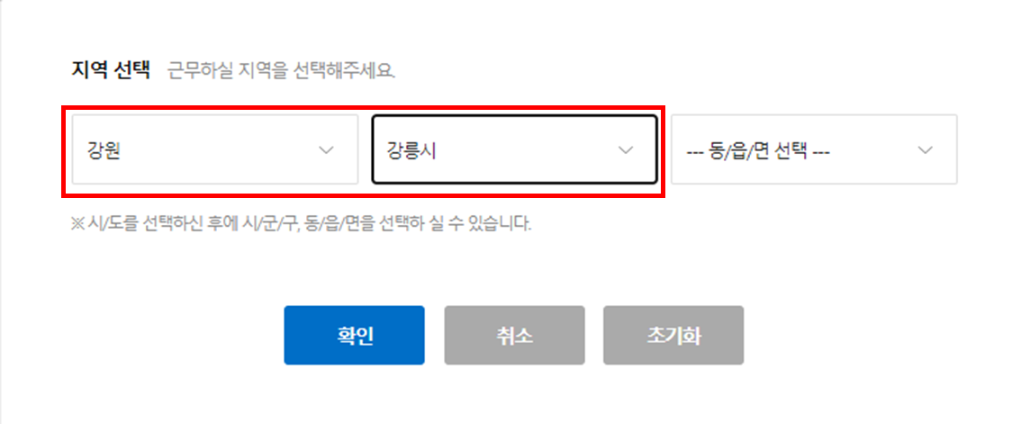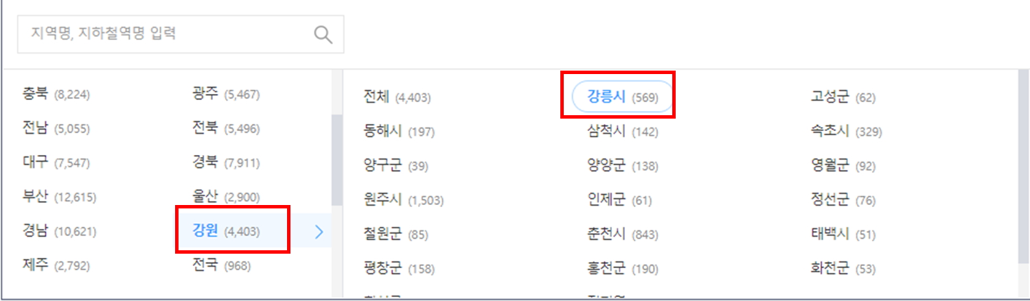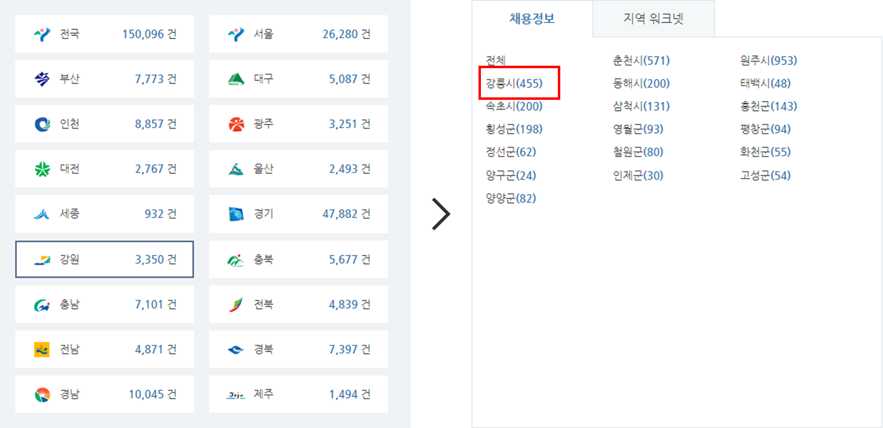 먼저, 잡코리아에 접속 > 지역별 세부메뉴에서 강원도, 강릉시를 선택하시면 됩니다.