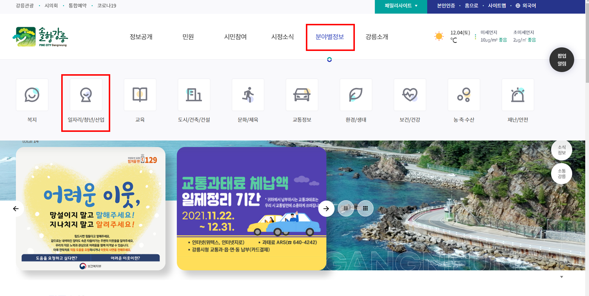 ① 강릉시청 홈페이지를 들어갑니다. 상단 메뉴 우측에 분야별 정보 > 일자리/청년/산업을 선택하세요.