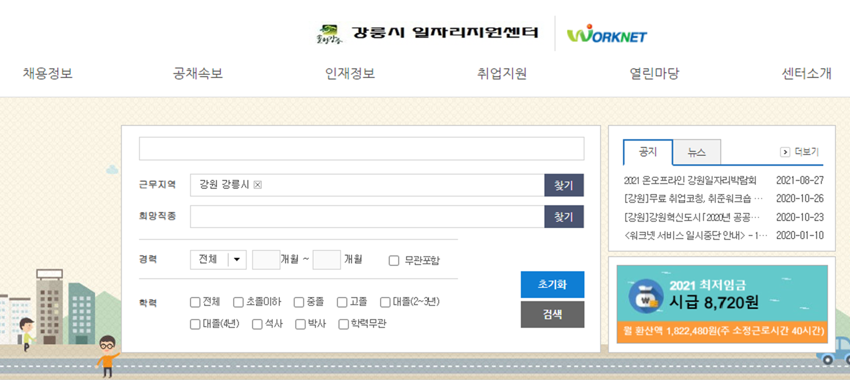 강릉시의 취업정보는 지역워크넷 취업사이트를 직접 접속하셔서 구인정보를 찾아보셔도 됩니다.