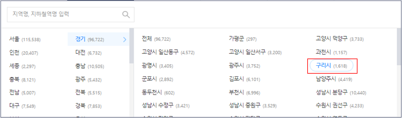 먼저, 벼룩시장에 접속 > 지역선택에서 경기도 > 구리시를 선택하시면 됩니다.
