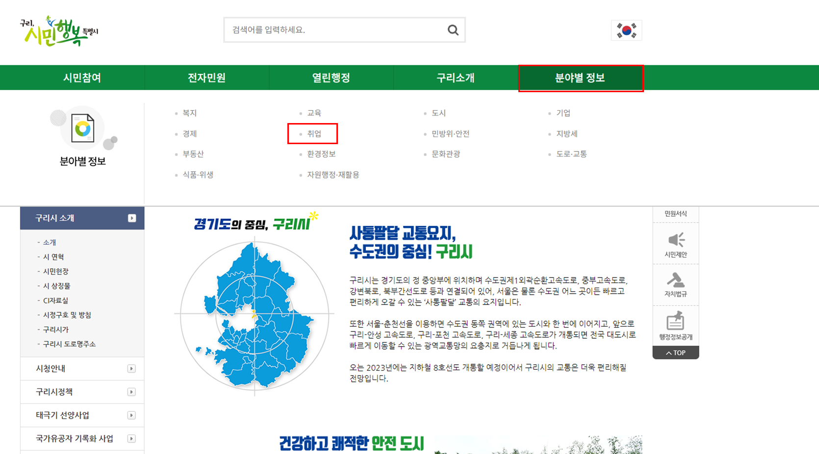 ① 구리시청 홈페이지를 들어갑니다. 상단 우측 메뉴에 분야별 정보 > '취업'의 세부메뉴를 선택해주세요.