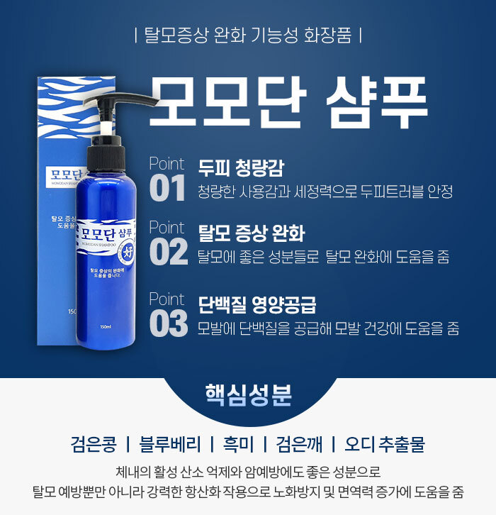 모모단 샴푸는 탈모가 진행되거나 탈모증상이 있는 분들께 증상방지나 개선효과를 볼 수 있도록 하는 제품으로 출시하였습니다.