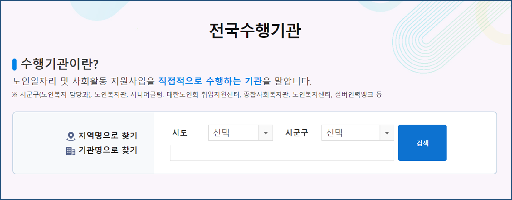 시군구 노인복지 담당과, 노인복지관, 시니어클럽, 대한노인회 취업지원센터, 종합사회복지관, 노인복지센터, 실버인력뱅크 등입니다. 본인 거주나 희망지역에서 일자리를 찾으시려면 아래와 같이 수행기관을 검색하셔서 문의하시는 것이 우선입니다.