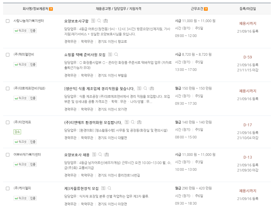 이천시 일자리 채용정보는 고용노동부가 운영하는 워크넷 정보와 연동되고 있습니다.