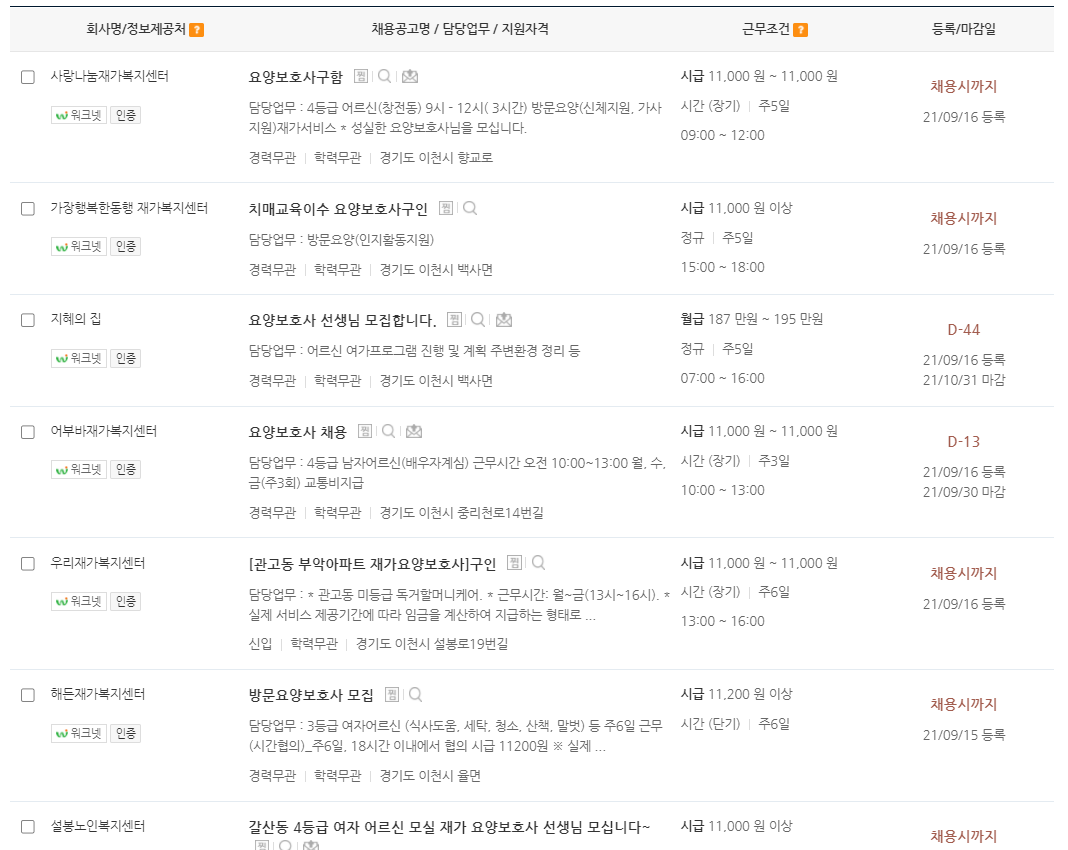 시급이 최저시급부터 11,000원까지 다양하게 검색이 됩니다. 요양보호사는 병원내의 근무시간 이외에 주간보호센터 경우 방문 케어 서비스를 하는 경우가 있습니다. 이럴 경우에 시간제 일자리로 채용을 많이 합니다.