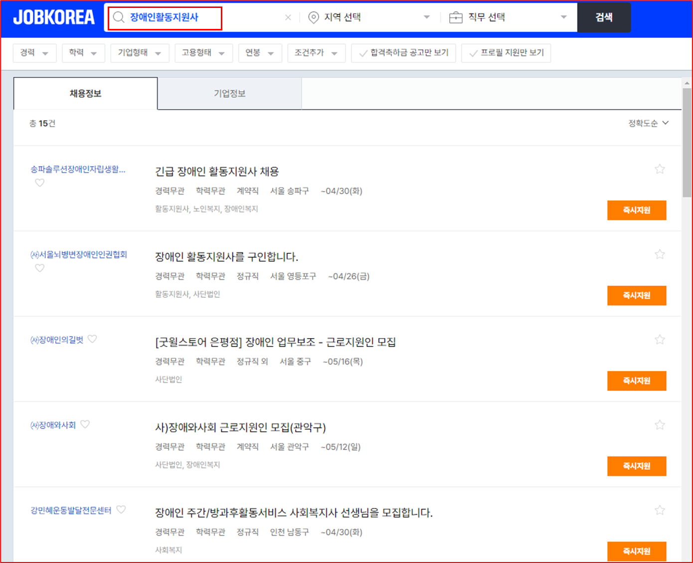 송파설루션장애인자립생활센터 장애인활동지원사 채용, 서울뇌병변장애인인권협회 장애인활동지원사, 장애인의 길벗 굿윌스토어 장애인 근로지원인 모집, 장애와 사회 근로지원인 모집, 강민혜운동발달전문센터 주간/방과 후 활동서비스 사회복지사, 해오름심리발달센터 발달장애인 주간활동서비스 제공인력 모집, 금천장애인자립생활센터 사회서비스팀 활동지원사업 코디네이터, 부천시장애인부모회 발달장애인 주간/방과 후 활동센터 인력 모집등의 다양한 일자리가 있습니다.