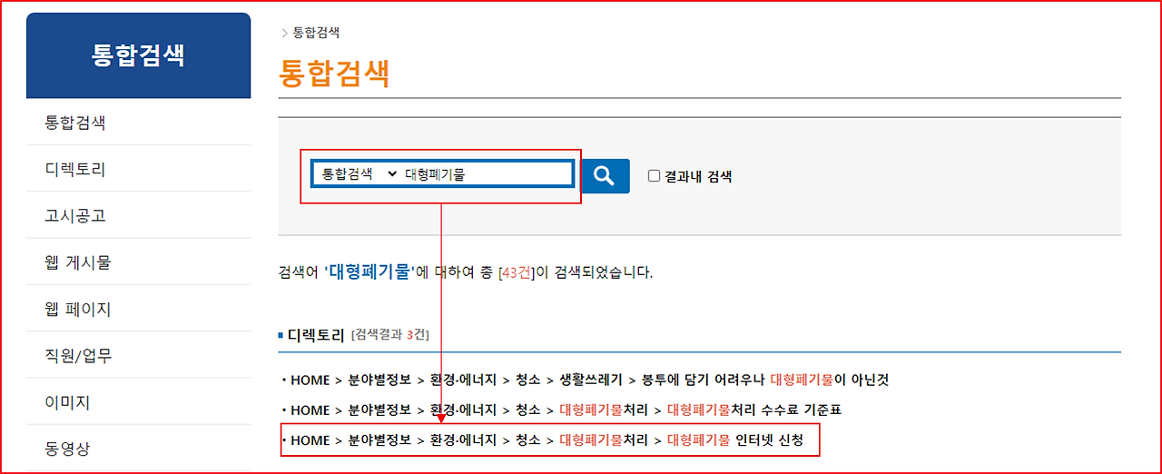 ① 광명시 홈페이지 접속 > 통합검색창 "대형폐기물" 입력 > 하단 인터넷신청을 순서대로 클릭하세요.