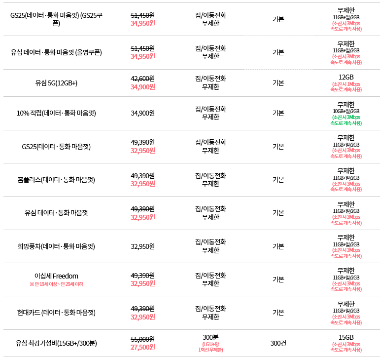 15GB부터 10GB까지 제공하는 상품과 10GB~5GB까지 제공하는 일반형 (가성비좋은 상품) 상품이 있습니다. 2.5GB이하 상품은 개인적으로 추천하지 않습니다.