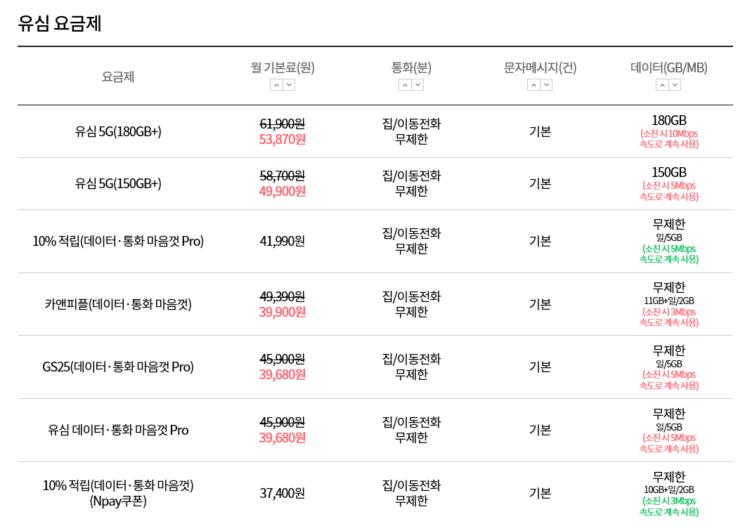 청소년 요금제와 알뜰한 요금제가 있습니다만, 1GB에서 300MB의 데이터를 제공합니다. 개인적으로 추천하지 않습니다.