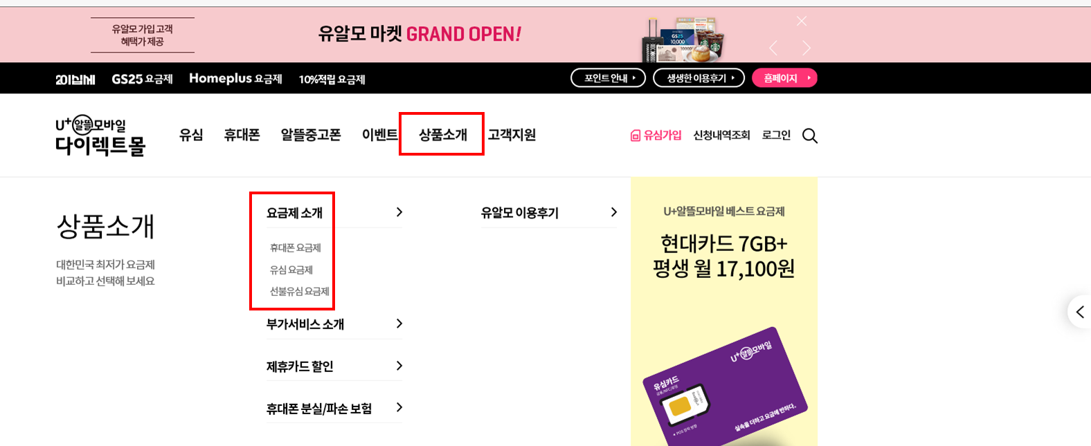 먼저, 상품소개를 들어가셔셔 요금제에 대해서 알아보겠습니다. 유심과 휴대폰, 알뜰중고폰 구매등은 아래에서 간단하게 설명드리겠습니다.
