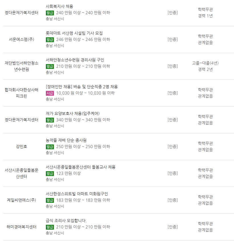 | 해미경찰복지센터 | 급식 조리사 모집 | 월급 | 210만 원 이상 ~ 210만 원 이하 | 학력무관 관계없음 |