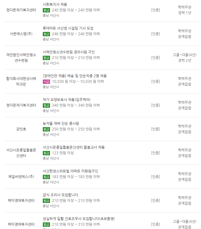 | 해미경찰복지센터 | 성실하게 일할 간호조무사 모집(초보 환영) | 월급 | 210만 원 이상 ~ 210만 원 이하 | 고졸~대졸(4년) |