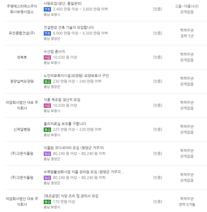 | 성복호 | 수산업 종사자 | 시급 10,030원 이상 | 충남 보령시 | 학력무관 | 관계없음 |
