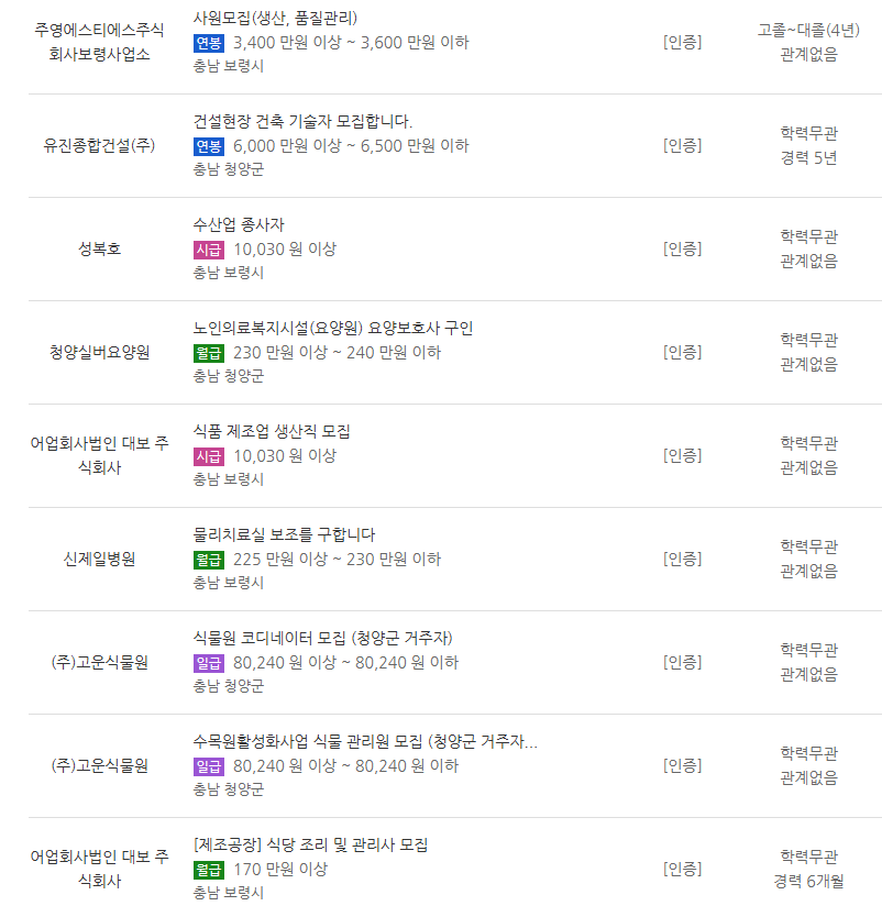 | 성복호 | 수산업 종사자 | 시급 10,030원 이상 | 충남 보령시 | 학력무관 | 관계없음 |