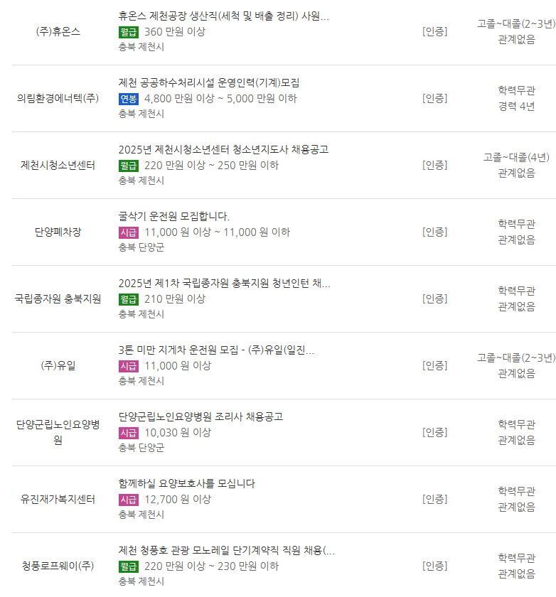 | 제천시청소년센터 | 2025년 제천시청소년센터 청소년지도사 채용공고 | 월급 220만원 이상 ~ 250만원 이하 | 충북 제천시 | 고졸~대졸(4년) | 관계없음 |