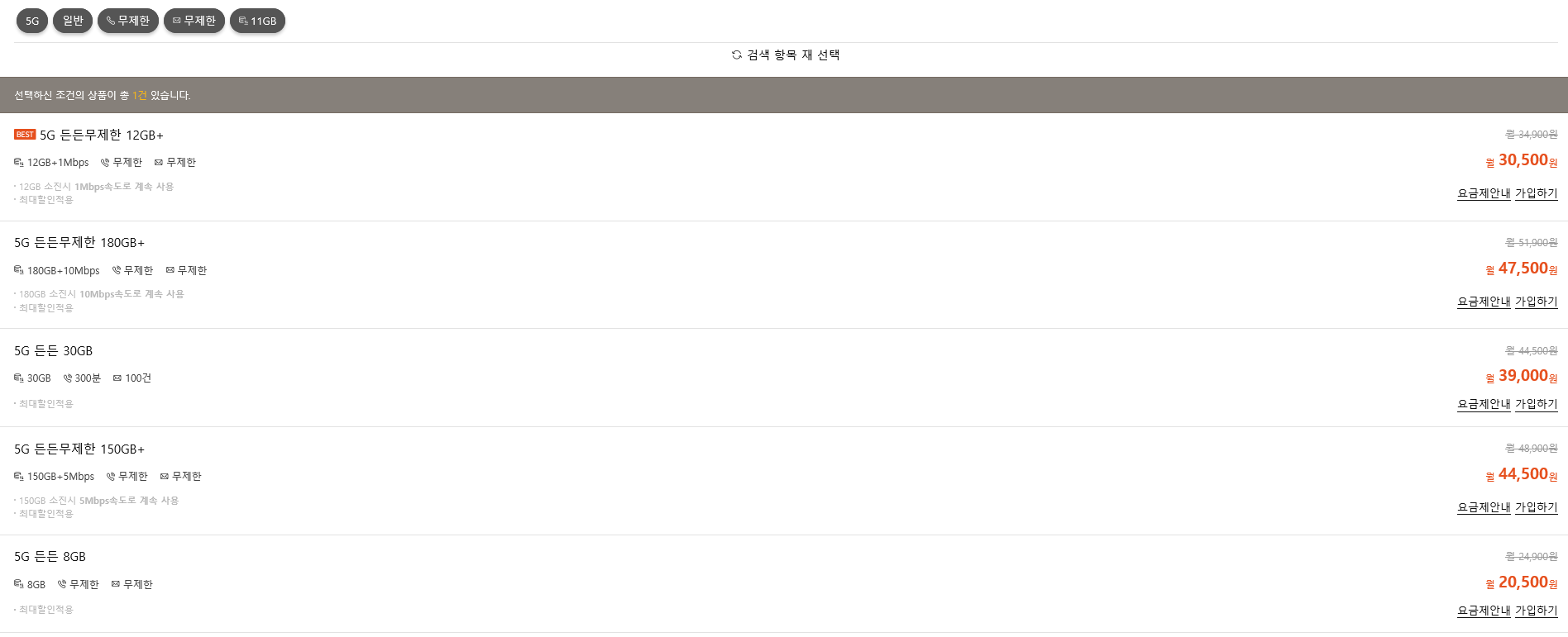 5GB 든든 무제한 요금도 많이 선택합니다. 요금은 14,500원 입니다.
