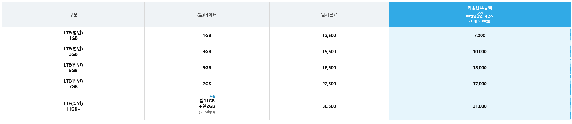 영업이나 필드, 법인기업을 대상으로 한 요금제는 직원들의 복리후생 제공 및 기타 부가서비스로 많이 신청하고 있습니다.